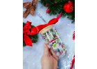 Sklenička ve tvaru plechovky s vinylovým potiskem součástí bambusové víčko a skleněné brčko.